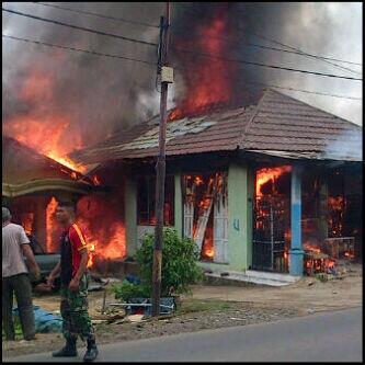 Api terlihat berkobar sekitar pukul 12.15 Wita, lokasinya persis didepan KOMPI 623 Pelaihari Kab.Tanah Laut adapun dua bangunan yang hangus tersebut adalah satu buah rumah dan satu buah kios.