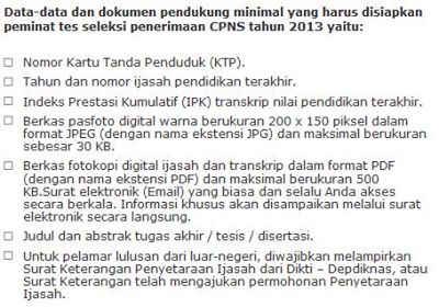 Persyaratan dan dokumen yang setidaknya yang harus disiapkan pelamar Calon Pegawai Negeri Sipil (CPNS) tahun 2013. Syarat administrasi sangat vital dan menentukan dalam penerimaan CPNS. Untuk itu silahkan diperhatikan syarat-syarat mengikuti test CPNS 2013 karena sebentar lagi pendaftaran akan dibuka. Pendaftaran CPNS 2013, dijadwalkan dimulai sejak tanggal 1-20 September, beberapa sumber lain ada juga yang menyebutkan sampai dengan tanggal 28 September 2013.