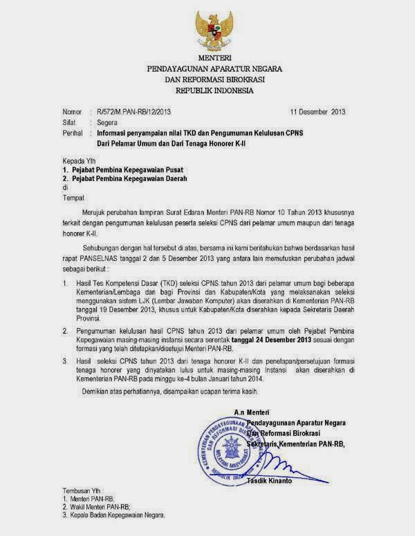 Surat Edaran Kemenpan-RB Pengumuman Hasil TKD CPNS 2013 |