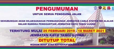"Pengumuman Untuk Semua Pengguna Jalan. Sehubungan dengan akan dilaksanakannya pembangunan jembatan Cable Stayed Sei Alalak. Dalam Rangka Penggantian Jembatan Kayu Tangi Ujung. Terhitung Mulai 25 Februari 2019 - 18 Maret 2021 Jembatan Kayu Tangi Ujung Di Tutup Total. Mohon Maaf Atas Ketidak Nyamanan Ini". Demikian isi yang tertulis di spanduk tersebut.