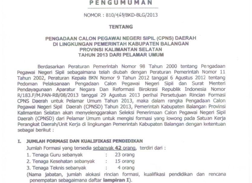 Pengumuman Formasi CPNS 2013 Balangan