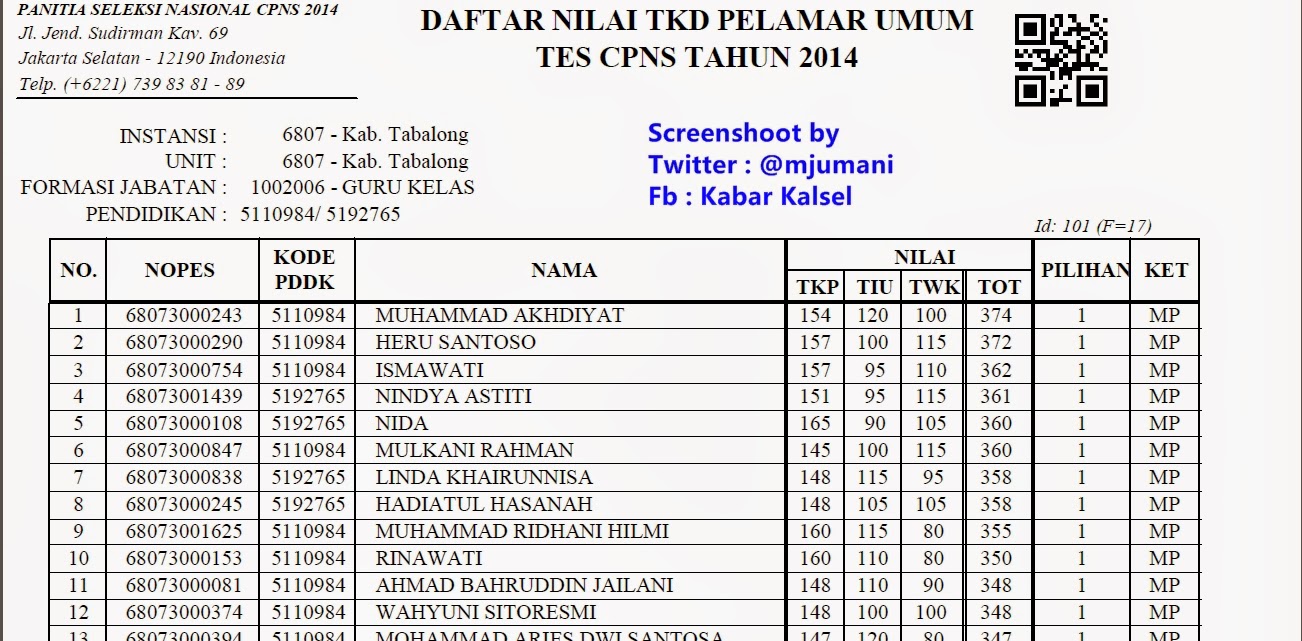 | Daftar Nilai Peserta Tes CPNS 2014 Kabupaten Tabalong |